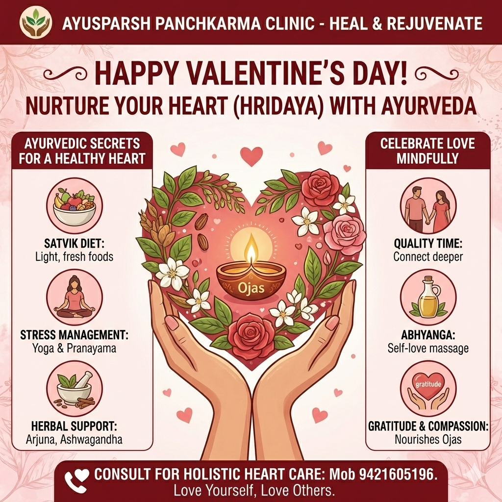 ❤️ Nurture Your Heart (Hridaya) This Valentine’s Day with Ayurveda Happy Valentine’s Day! While the world celebrates with roses and chocolates, Ayurveda invites you to look deeper into the 'seat of your soul'—the Hridaya (Heart). In Ayurveda, the heart is not just a physical pump; it is the home of Ojas (our vital energy and immunity) and the center of our emotions. A healthy heart requires a balance of physical care and emotional peace. How to Show Your Heart Some Love: 🥗 Eat for Ojas: Choose a Satvik Diet. Fresh, seasonal fruits, whole grains, and leafy greens keep your arteries clear and your energy high. 🌿 Lean on Herbal Heroes: Nature has given us Arjuna and Ashwagandha. These powerful herbs help strengthen the heart muscles and manage the 'silent killer'—stress. 💆‍♂️ Practice Abhyanga: Self-massage with warm oil is the ultimate act of self-love. It calms the nervous system and improves circulation. 🧘 Mindful Movement: Yoga and Pranayama are like a 'reset button' for your heart rate and blood pressure. ✨ Cultivate Gratitude: Positive emotions like compassion and gratitude nourish your Sadhaka Pitta (the sub-dosha of the heart), keeping you emotionally resilient. This Valentine’s Day, don't just give your heart away—take care of the one you have! 🌸 Treat yourself to a heart-opening treatment at Ayusparsh. 📞 Book Your Heart-Health Consultation: Mob 9421605196 📍 Visit Us: Shop no 10, Anand Heritage, Khutwad Nagar, Nashik AYUSPARSH PANCHKARMA CLINIC – Heal & Rejuvenate