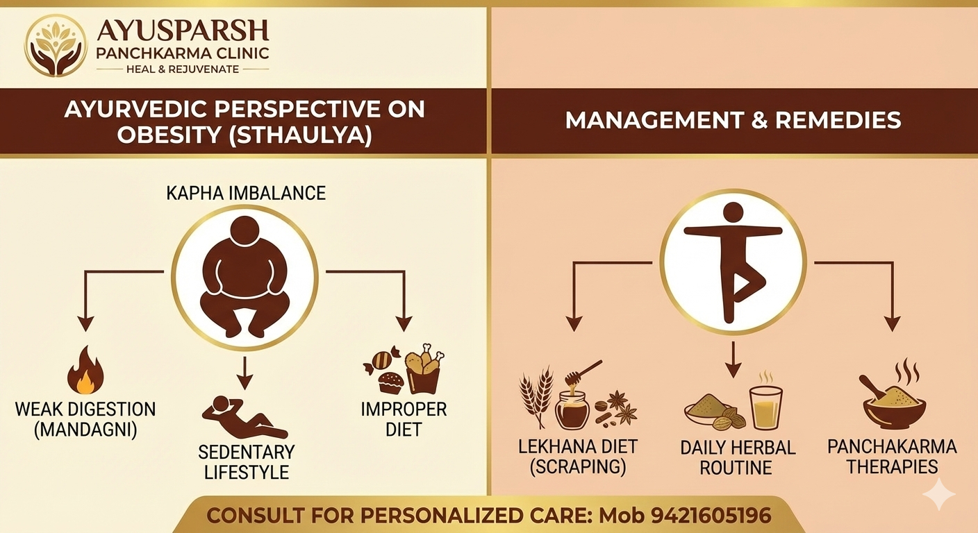 According to Ayurveda, obesity is known as Sthaulya, a disorder caused by imbalance of Kapha Dosha, weakened digestive fire (Mandagni), and accumulation of toxins (Ama) in the body.