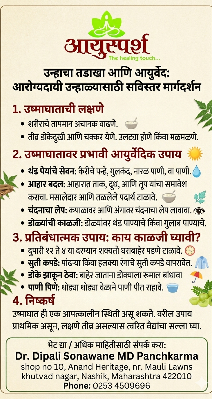 उन्हाचा तडाखा आणि आयुर्वेद: उष्माघातापासून बचावासाठी प्रभावी घरगुती उपाय उन्हाळ्याची चाहूल लागताच वाढत्या तापमानामुळे शरीराची लाहीलाही होऊ लागते. या ऋतूत प्रखर सूर्यप्रकाश आणि उष्ण वाऱ्यांमुळे उद्भवणारी सर्वात गंभीर समस्या म्हणजे 'उष्माघात' (Sunstroke). आयुर्वेदानुसार, शरीरातील 'पित्त' दोष वाढल्यामुळे आणि उष्णतेचा थेट संपर्क आल्यामुळे ही स्थिती निर्माण होते. या ब्लॉगमध्ये आपण उष्माघाताची लक्षणे आणि त्यापासून वाचण्यासाठी आयुर्वेदात सांगितलेले सोपे उपाय जाणून घेणार आहोत. उष्माघाताची प्रमुख लक्षणे उष्माघात झाल्यास शरीर खालील संकेत देते: शरीराचे तापमान अचानक वाढणे. तीव्र डोकेदुखी आणि चक्कर येणे. उलट्या होणे किंवा मळमळणे. त्वचा कोरडी पडणे आणि प्रचंड तहान लागणे. अतिशय थकवा जाणवणे किंवा बेशुद्ध पडणे. उष्माघातावर प्रभावी आयुर्वेदिक उपाय आयुर्वेदामध्ये उन्हाळ्यातील विकारांवर थंडावा देणारे आणि नैसर्गिक पित्तशामक उपाय सुचवले आहेत: १. थंड पेयांचे सेवन (Aatapa Sevana) कैरीचे पन्हे: उन्हाळ्यात कैरीचे पन्हे हे सर्वोत्तम औषध मानले जाते. हे शरीरातील पाण्याचे प्रमाण संतुलित ठेवते आणि उष्णतेपासून संरक्षण करते. गुलकंद: दिवसातून दोनदा एक चमचा गुलकंद खाल्ल्याने शरीरातील पित्त कमी होते आणि थंडावा मिळतो. नारळ पाणी आणि वाळा पाणी: नैसर्गिक इलेक्ट्रोलाईट्ससाठी नारळ पाणी प्यावे. तसेच पिण्याच्या पाण्यात 'वाळा' टाकून ते पाणी घेतल्यास शरीराचे तापमान नियंत्रित राहते. २. आहार बदल आहारात, दूध, आणि तूप यांचा समावेश करावा. जड, मसालेदार आणि तळलेले पदार्थ खाणे टाळावे, कारण यामुळे शरीरातील उष्णता वाढते. काकडी, टरबूज, आणि द्राक्षे यांसारखी रसाळ फळे खावीत. ३. चंदनाचा लेप जर उन्हामुळे अंगाचा दाह होत असेल, तर कपाळावर आणि अंगाला चंदनाचा लेप लावावा. चंदन हे अत्यंत शीत (थंड) गुणधर्माचे असल्याने ते तत्काळ आराम देते. ४. डोळ्यांची काळजी उन्हामुळे डोळ्यांची आग होत असल्यास, डोळ्यांवर थंड पाण्याच्या किंवा गुलाब पाण्याच्या पट्ट्या ठेवाव्यात. प्रतिबंधात्मक उपाय: काय काळजी घ्यावी? वेळ पाळा: दुपारी १२ ते ४ या दरम्यान शक्यतो घराबाहेर पडणे टाळावे. सुती कपडे: बाहेर जाताना पांढऱ्या किंवा हलक्या रंगाचे सुती कपडे वापरावेत. डोके झाकून ठेवा: कडक उन्हात जाताना डोक्याला रुमाल बांधावा किंवा छत्रीचा वापर करावा. पाणी पिणे: तहान लागलेली नसली तरीही थोड्या थोड्या वेळाने पाणी पीत राहावे. निष्कर्ष उष्माघात ही एक आपत्कालीन स्थिती असू शकते. वरील उपाय प्राथमिक स्वरूपाचे असून, जर लक्षणे तीव्र असतील तर विलंब न करता तज्ज्ञ वैद्यांचा किंवा डॉक्टरांचा सल्ला घेणे आवश्यक आहे. निसर्गाच्या सोबतीने आणि आयुर्वेदाच्या मार्गदर