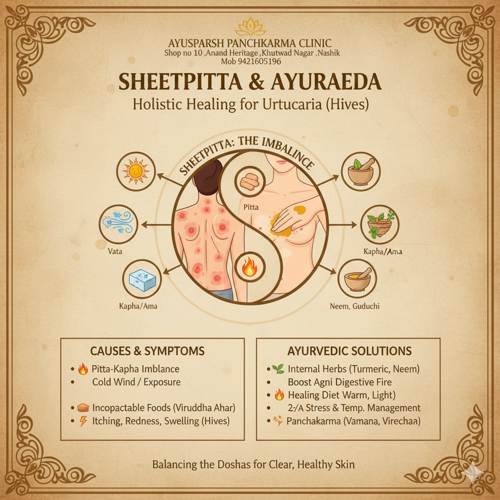 आयुर्वेदात शीतपित्त हा कफ वात–पित्तप्रधान त्वचारोग मानला जातो आणि त्याचे मूळ कारण केवळ त्वचेपुरते मर्यादित नसून आग्नेय, मानसिक आणि अन्नजन्य असते.