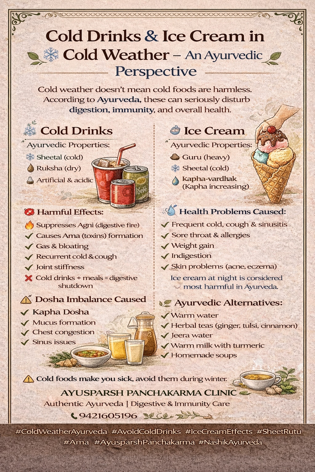 During cold weather, many people continue consuming cold drinks and ice creams, assuming they are harmless. However, according to Ayurveda, this habit can seriously disturb digestion, immunity, and overall health.