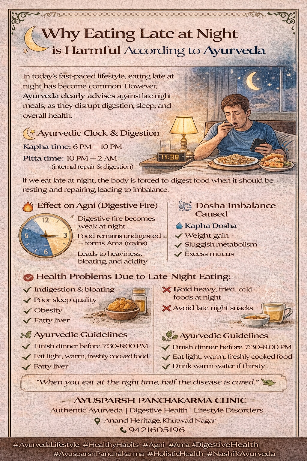 In today’s fast-paced lifestyle, eating late at night has become common. However, Ayurveda clearly advises against late-night meals, as they disturb digestion, sleep, and overall health.