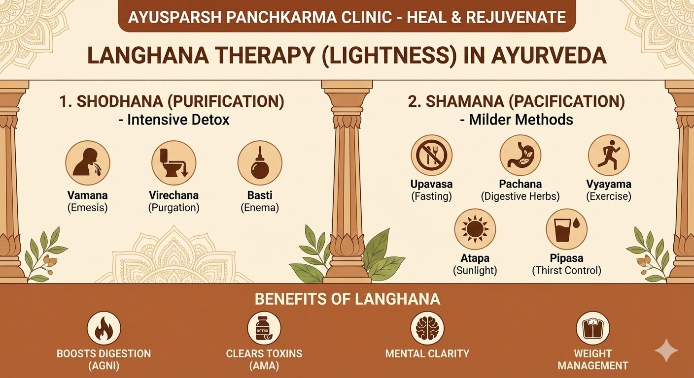 “लघु करणं म्हणजेच लघंन” – म्हणजे शरीरातील जडपणा कमी करून नैसर्गिक समतोल पुनः प्रस्थापित करणे.